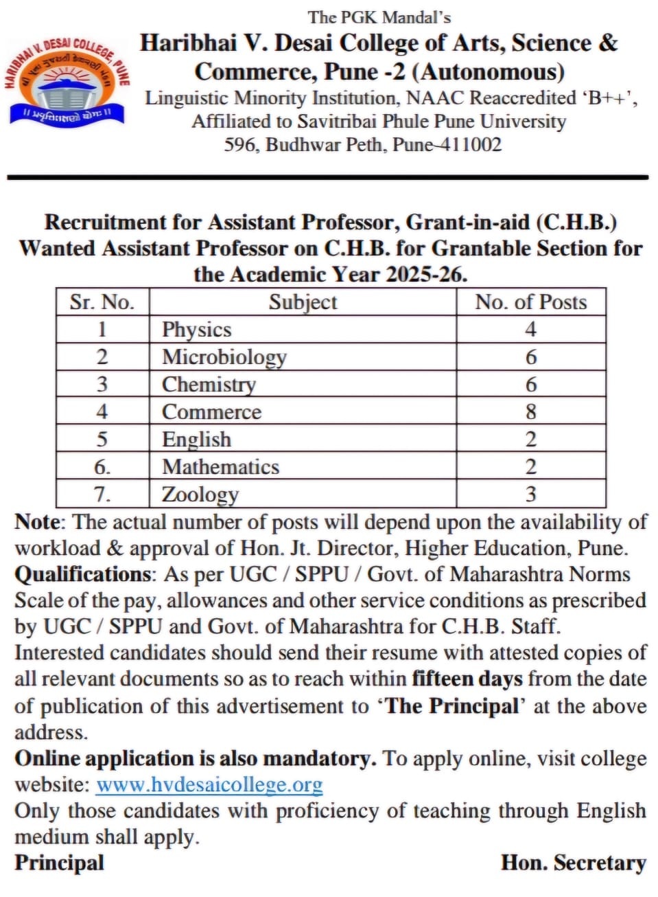 Grantable Section Recruitment for Assistant Professor (CHB) - Academic Year 2025-26 ☛ Link for Online Application: https://https://forms.gle/ZNN7rVku58NpDozS6